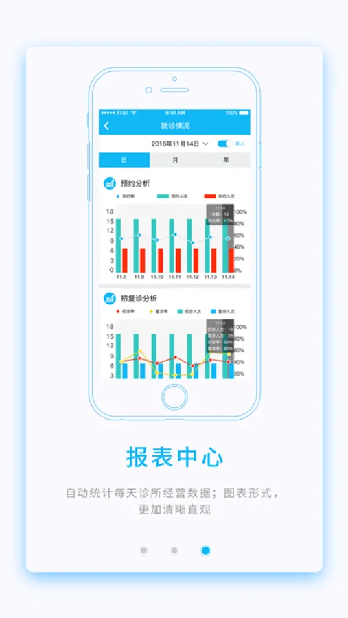 [报表中心]:分为就诊情况、账单分析、诊所收支三个板块。根据就诊情况自动统计每天诊所经营数据。采用图表形式,更加清晰直观。