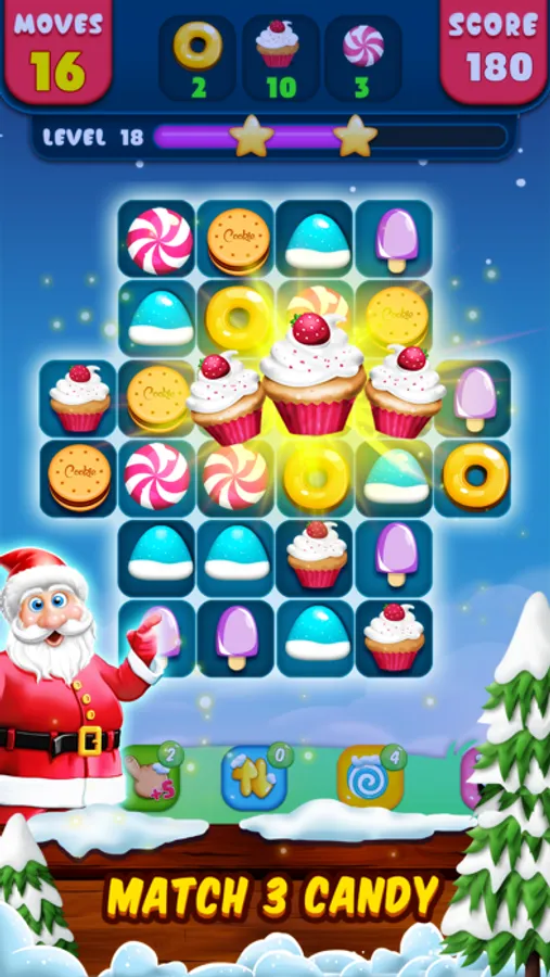 Swap and Match 3 or more cookies, cupcakes, donuts, jellies, lollipops, candies, Ice-cream, Santa hats, and similar properties to complete the fabulous levels.