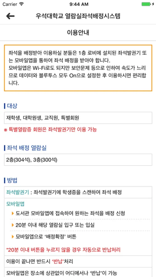 우석대학교 학습도서관 좌석배정 시스템 Screenshots