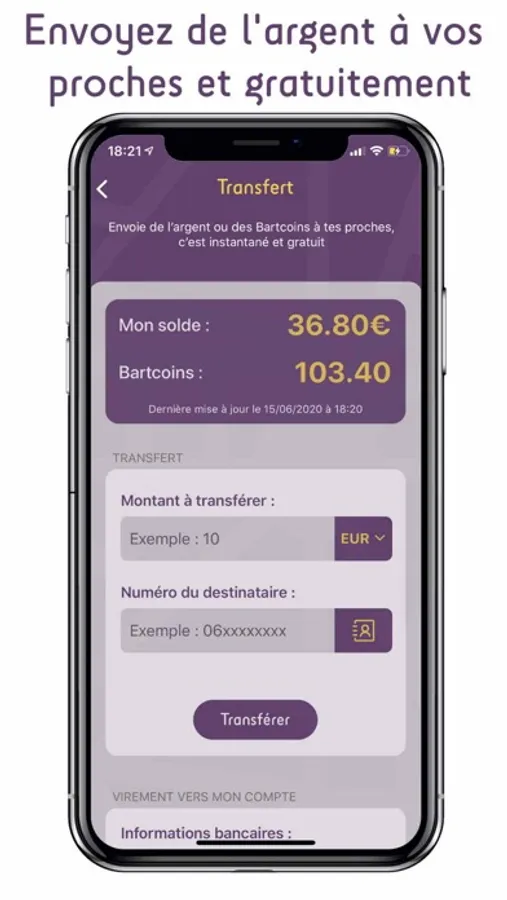 - envoyez de l'argent ou partager vos Bartcoins de votre porte-monnaie instantanément et gratuitement à votre famille et à vos amis.