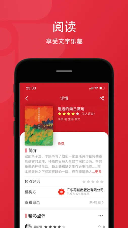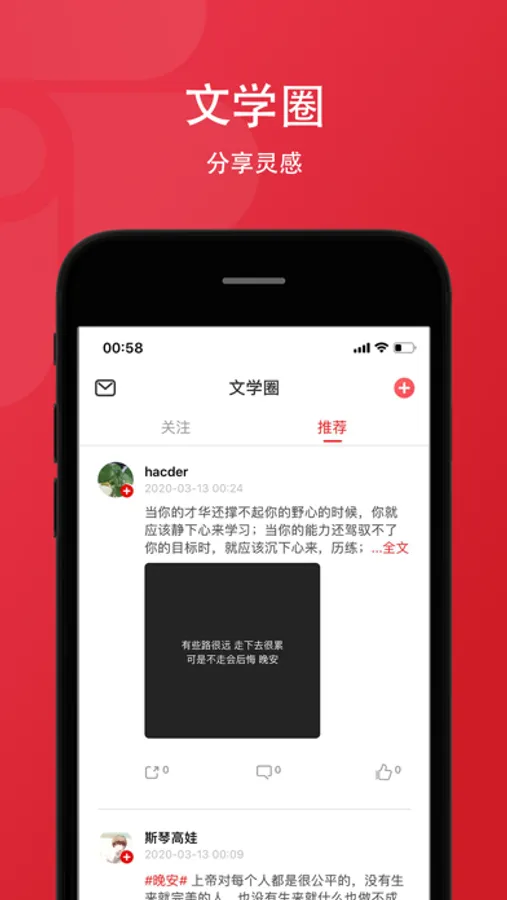 文学圈:通过文学圈,用户可随时记录突发感想、分享图书、发表评论;作者和读者可通过关注来互动,了解对方的动态。