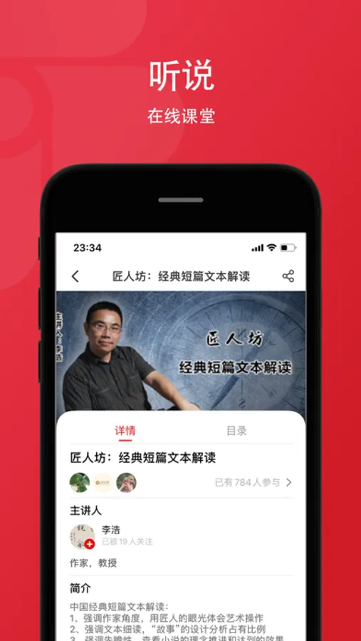 听说:听说功能为爱花城在线课程,主要有两大主体---主讲人与用户。主讲人在爱花城平台设计并发起线上直播或录播课程,用户响应并参与课程。平台方邀请国内知名作家、评论家、教授导师前来分享文学知识,给用户提供学习与交流的平台,增强阅读、创作与教育之间的联系。