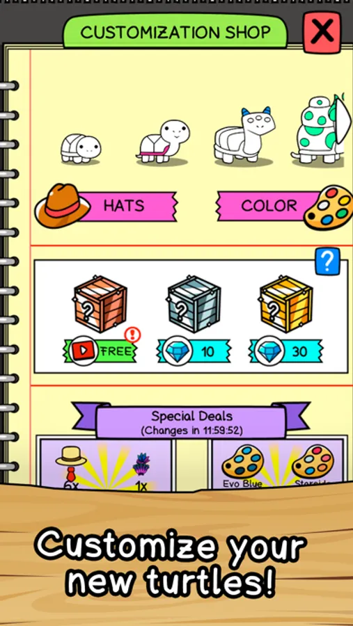 In this AWESOME evolution game, you’ll meet all kinds of turtles! Make them evolve and discover new ones while you make money out of the very special TURTLE EGGS!