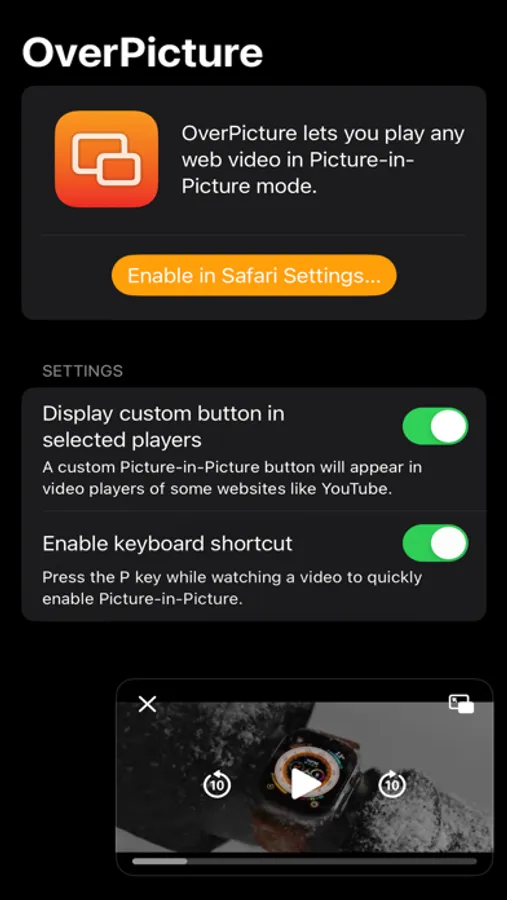 • You can enable the OverPicture Extension from the Extensions section of Safari settings.