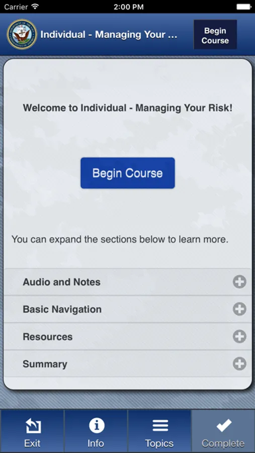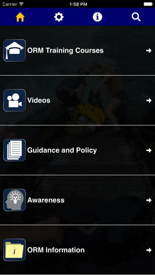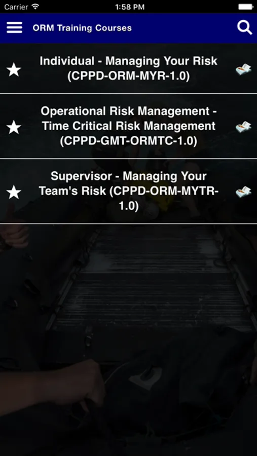 The Operational Risk Management app, or ORM app, offers users three risk management courses developed by the Naval Education and Training Command and the Naval Safety Center. These courses teach users ways to avoid and mitigate various types of risk when performing Navy tasks, missions, and operations, as well as risk in their personal activities.