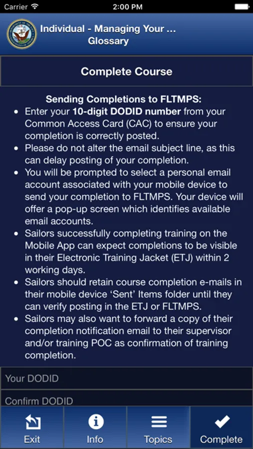 • DON personnel may use the app to complete their annual mandatory training. End-of-course completions can be emailed to Navy Training Management and Planning System (NTMPS) for display in the Electronic Training Jacket (ETJ).