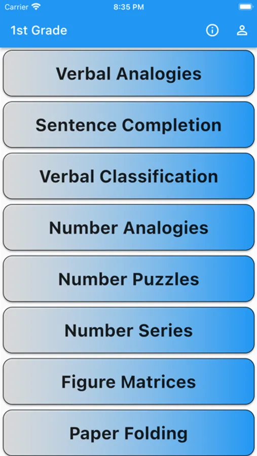 Updated for 2022! Train for gifted and talented testing. This app is designed to increase reasoning and problem solving skills for kids in the first grade. Specifically the exercises within are for mastering the COGAT FORM 7 (Level 7) test. Inside you'll find a full test for the language and visual test portions and hundreds of questions for the number/math type areas of study.