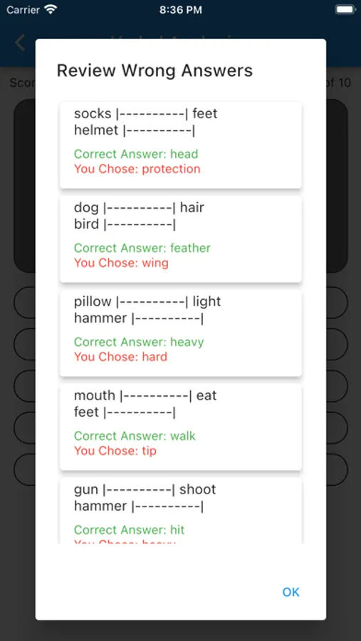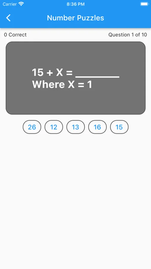We present a quiz of 10 questions from a bank of questions stored in the app. You get a score and the number right/wrong as well as indication of correct answers then tapped.