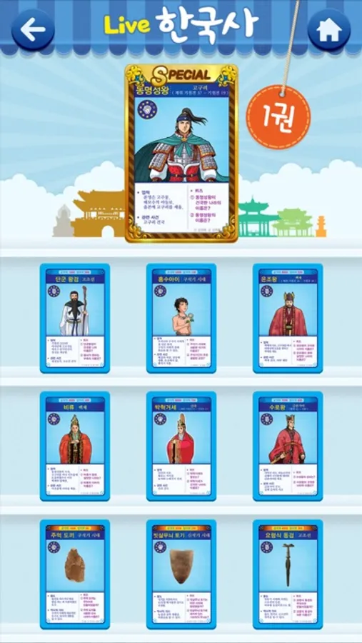 부록 동영상 역사카드는 만화책 1권당 통 10장이 들어있으며, 10장 중 1장은 각 인물에 대한 증강현실과 3D애니메이션, 9장은 2D애니메이션으로 되어 있습니다.