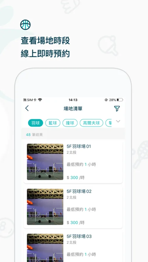 ● 場地預約:確認運動場地類別後,開始預約,可以選擇時段、日期,顯示可預約場地清單,點選預約該場地