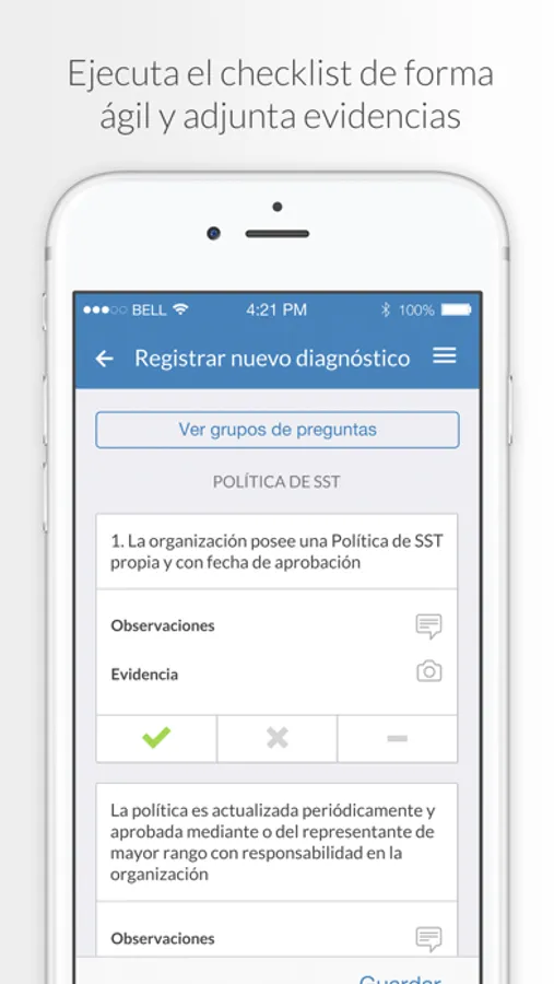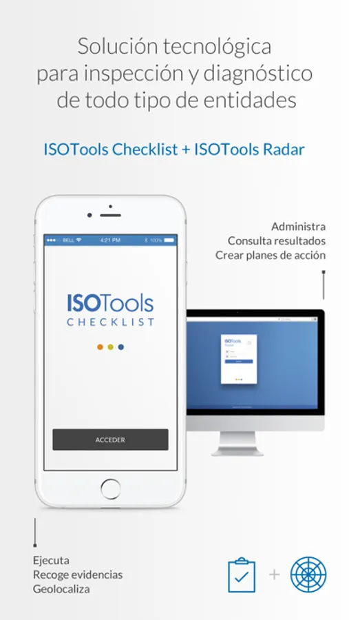 Forma parte de una solución integral para inspección y diagnóstico de todo tipo de entidades, en conjunto con la plataforma ISOTools Radar, espacio web en el que se administran las actividades a evaluar y se consultan los informes de resultados. Desde ISOTools Radar existe la posibilidad de realizar planes de acción para las no conformidades registradas en ISOTools Checklist.