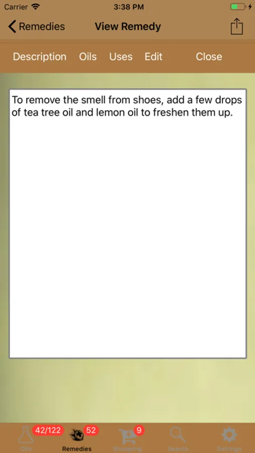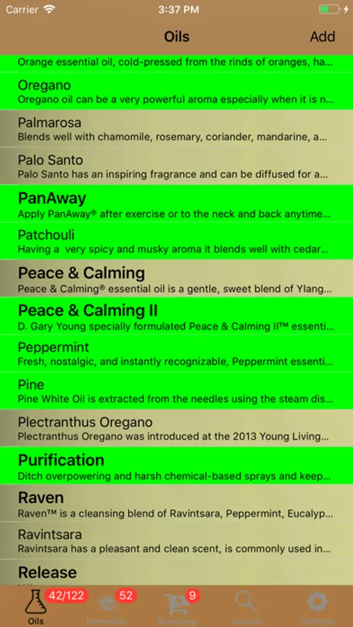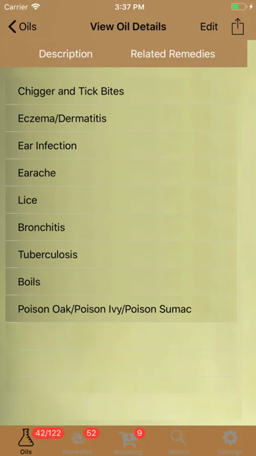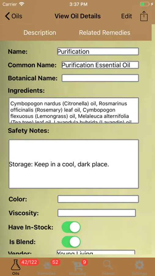 The My Essential Oil Remedies iOS application was created to help store your essential oils and Remedies. It will allow you to save oils details of oils that you have and don’t have. The ones that you don’t have are something you might have as a reference or something that you want later on. While viewing the oil details, you can also see which remedies have them listed.