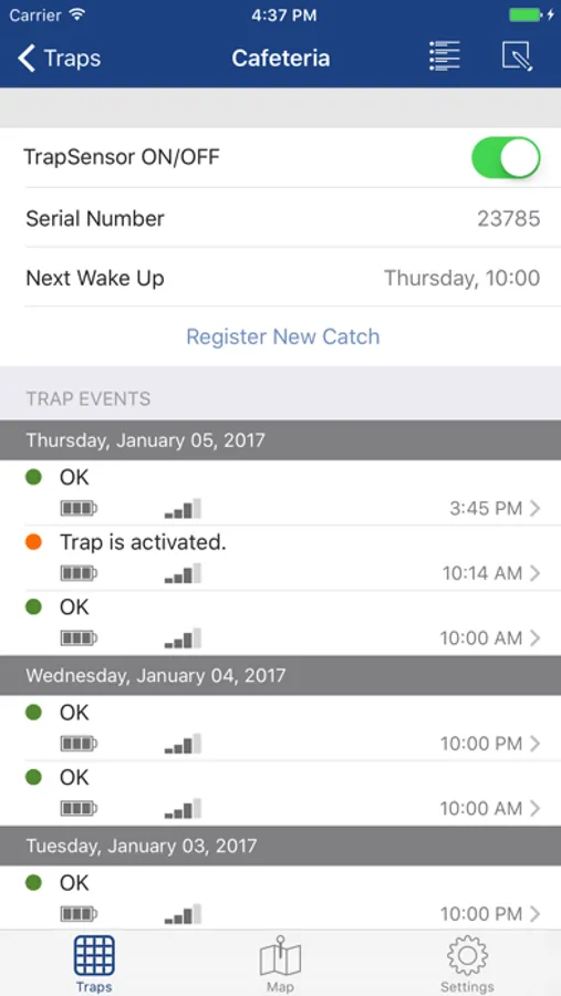 TrapSensor is a rat trap with electronics inside which constantly monitors the trap status. TrapSensor notifies you via push, email and/or text message whenever the trap shuts. This app lets you manage your device settings and also monitor your traps 24/7. TrapSensor units are waterproof and battery driven.