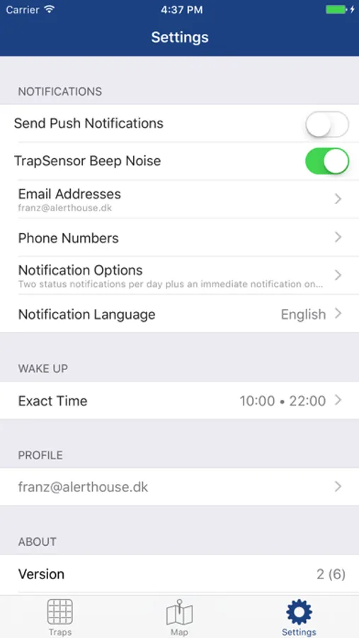 With this app, you can easily set up and configure your TrapSensor units. You can edit which email addresses and phone numbers notifications should be sent to. In addition, you can set a time for daily notification messages. Daily notification messages summarize the status of all of your traps in one message.