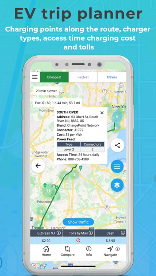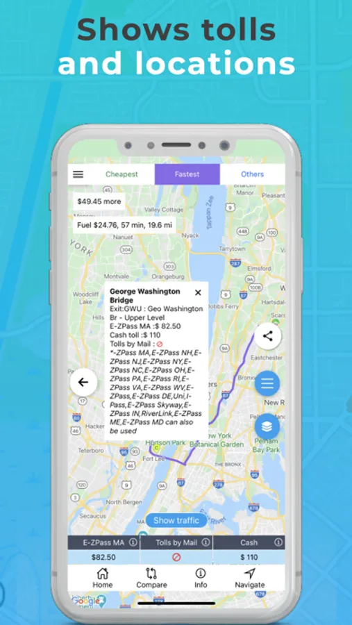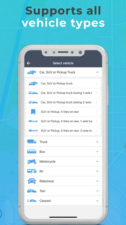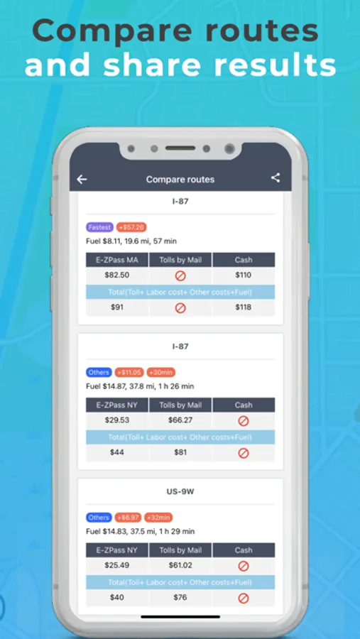 TollGuru Toll & Fuel (gas, petrol, diesel, electricity) trip calculator computes toll & cost for car, carpool, EVs, taxi, rideshare, truck, trailer, bus, RV and motorcycle. Travel on the cheapest, the fastest, and compromise routes post time and cost tradeoff.