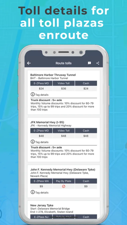 All including- NJ turnpike, Ohio turnpike, New York bridges, Holland tunnel, Florida roads, Chicago Skyway, 17-Mile Drive, Illinois toll, Indiana toll road, Texas toll roads, Kansas turnpike, Pennsylvania turnpike, Tappan Zee bridge, Ambassador Bridge, Yamuna Expressway, Pune Mumbai Expressway, Sydney Harbour Bridge, 407 ETR, M6 toll, M50 toll.