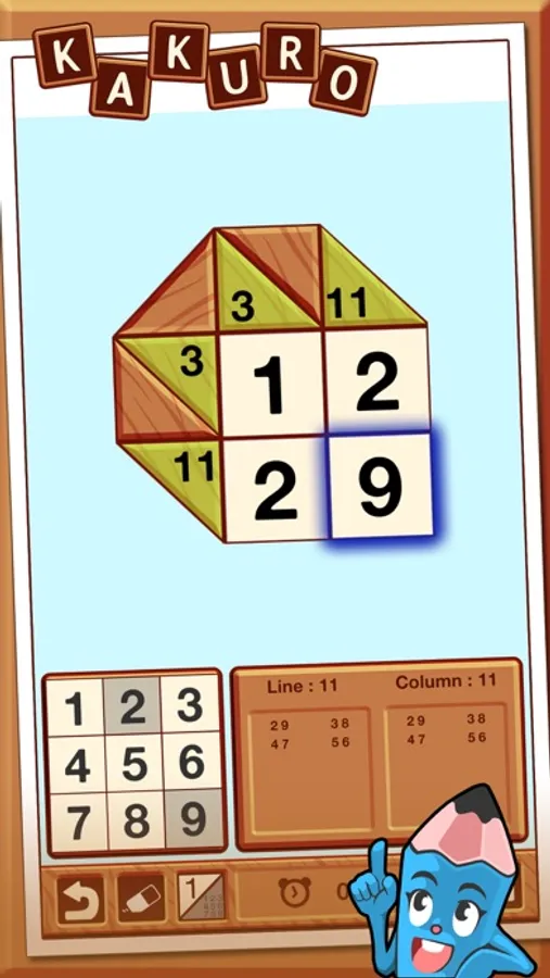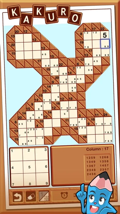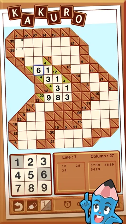 Kakuro, also know as cross sums, is a Japanese puzzle game which combines the Sudoku and crossword principles. Find the right combination of numbers whose sum is the clue written on the edge of the grid. Each digit must be unique in any given sum. You win the game when the grid is completed with the correct digits in every cell !