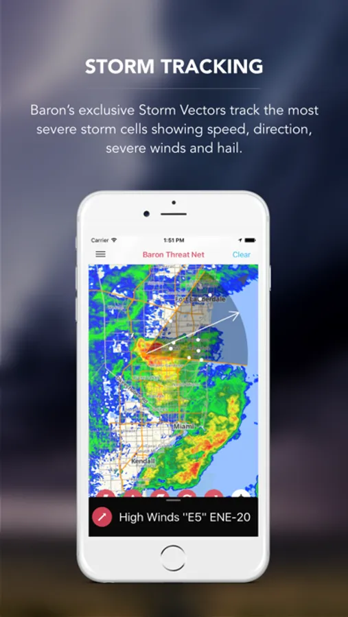 • Baron Storm Vectors project a storm’s movement up to an hour in advance, along with locating hidden threats within every storm.