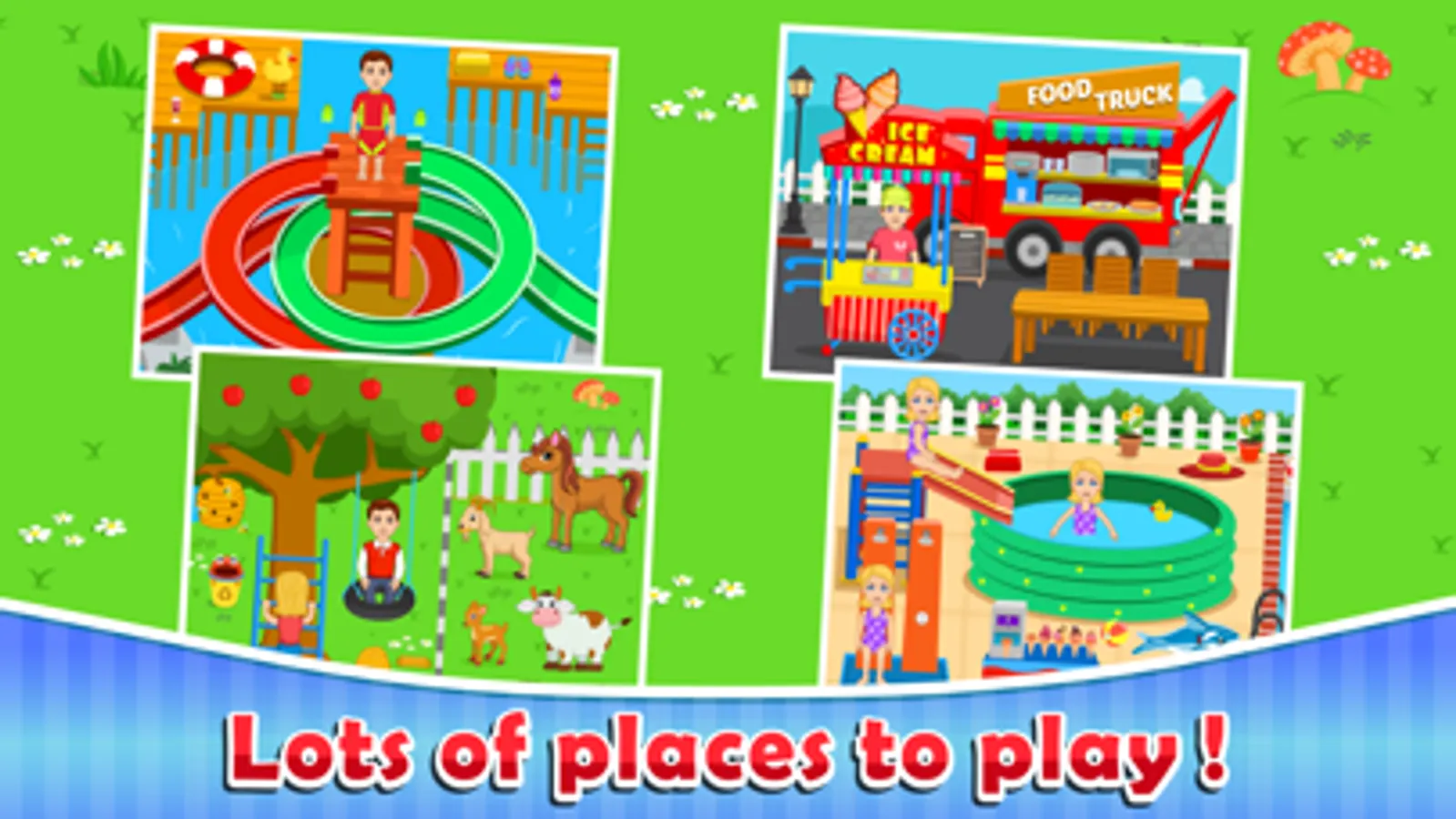 Welcome to Tots Town outdoor pretend play. This colorful fun app lets kids explore and play in six location -