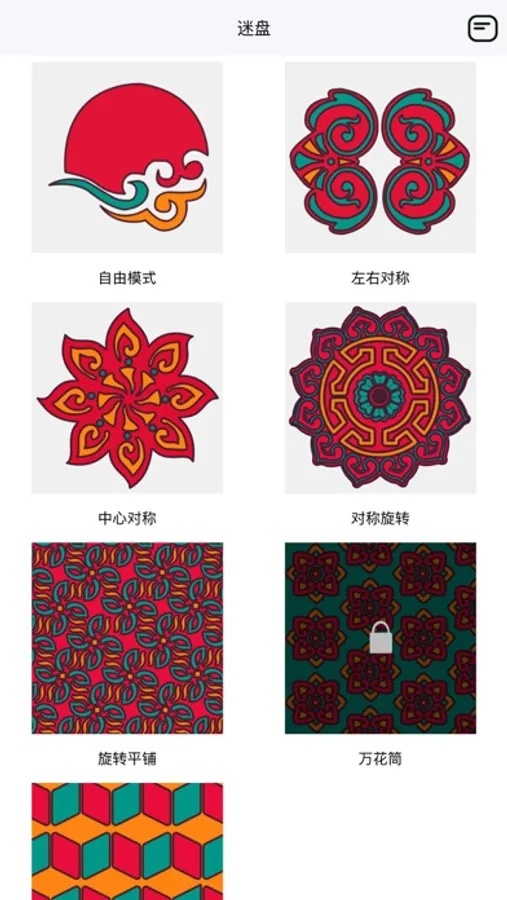 程序中提供了7种不同的绘画形式,有无对称、水平对称、垂直对称、斜对称、中心对称、对称旋转和平铺的方式,将万花筒的原理呈现于您的每一个线条,形成完全不一样的图案,每一笔落下都会给您带来不同的惊喜。极致的体验将颠覆您对所有绘画工具的看法,画面的未知与流畅感使您舍不得离开迷盘。移动的终端使您更加方便,随时随地尽情创作,畅享迷盘带给您的乐趣。使用迷盘进行无意识创作的成品,不亚于市面上的工艺品,甚至可以将其定制成为生活用品和摆件,为家中增添更多的生活情趣。