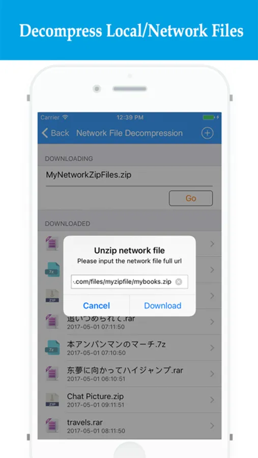 Network Decompress: input zip/rar/7z compressed file URL address, APP download and decompress it.