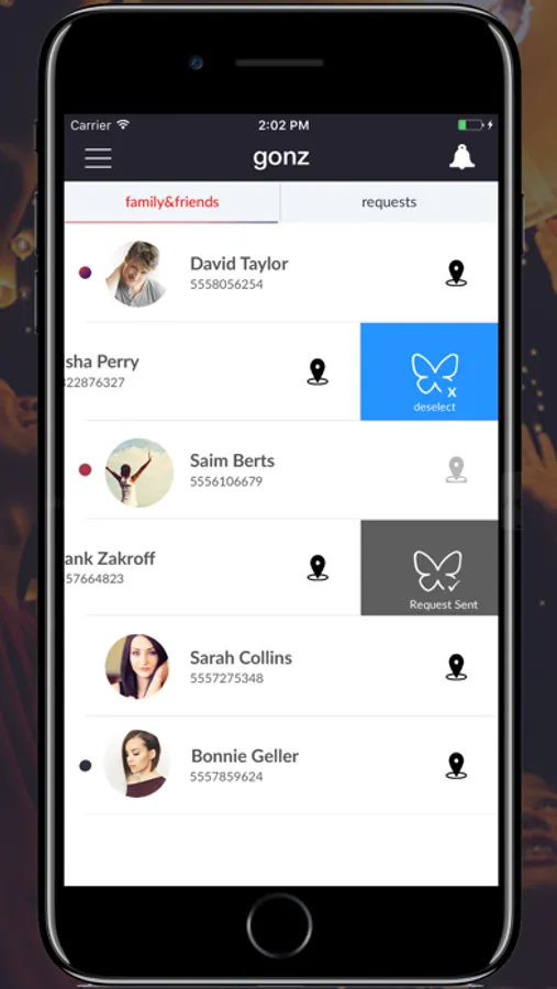 The ‘My Friends and Family’ tab allows you to search for friends or family members already registered and who have the Gonz App, and also allows you to send a nominee request.