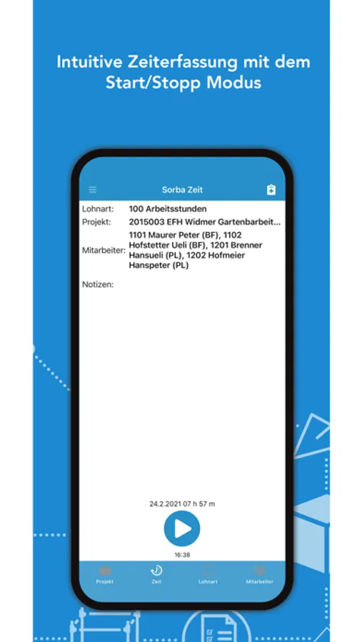 Die Baustellenzeiterfassung von SORBA ermöglicht eine exakte Zeiterfassung. Die Arbeitszeiten und Pausen lassen sich durch die Angabe der ‚von/bis Zeiten‘ auf die Minute genau rapportieren.