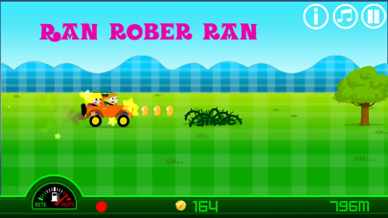 Izan zaitez trebea autoa gidatzen. Saihestu zuhaitzak eta gainerako oztopoak eta egin salto haien gainetik bi aldiz klik eginez. Hartu gasolina, aurrera egin ezinik utziko baitzaitu bestela autoak!