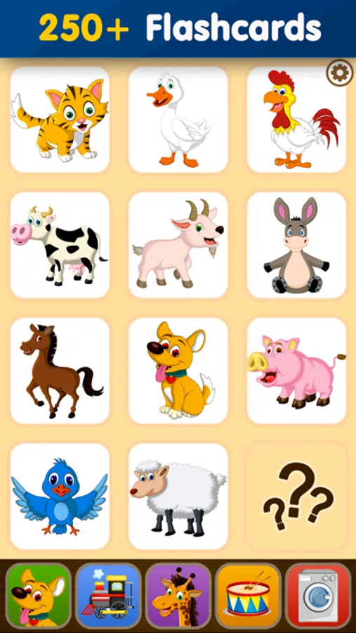 • 250+ toddler flashcards in 5 categories: Animals, Vehicles, Home, Wild Animals & Musical Instruments.