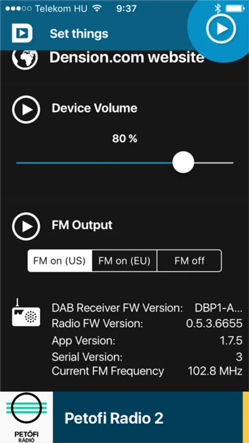 You can also use automatical frequency set up if you tap on the little magnifying icon on the top left corner of the pop up menu. In this case the device automatically searches for free FM frequency and sets the device there. After that you will see the exact frequency in a pop up menu and the app will drop you back to the ‘Set things’ menu.