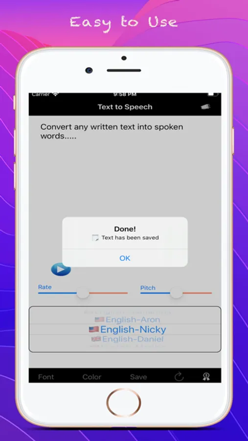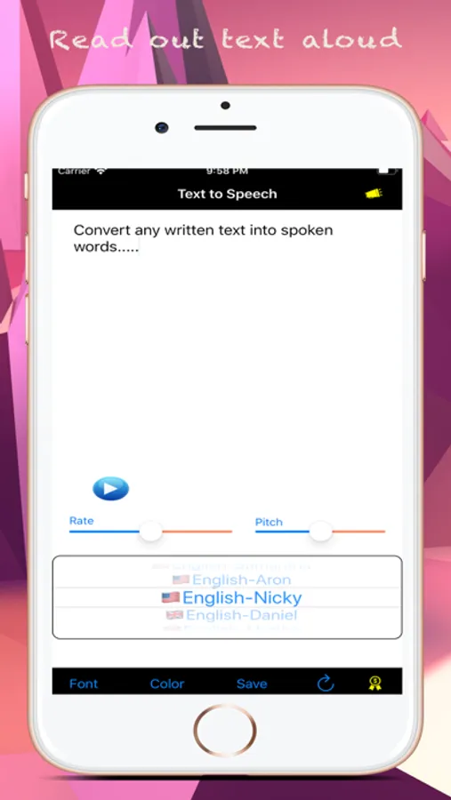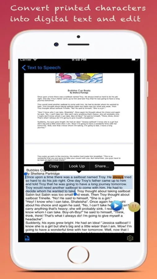 Text To Speech App combines natural sounding voices with the ability to read aloud any form of text in more than 20 languages , Bring typed word and sentences to life using your iPhone,iPod or iPad!