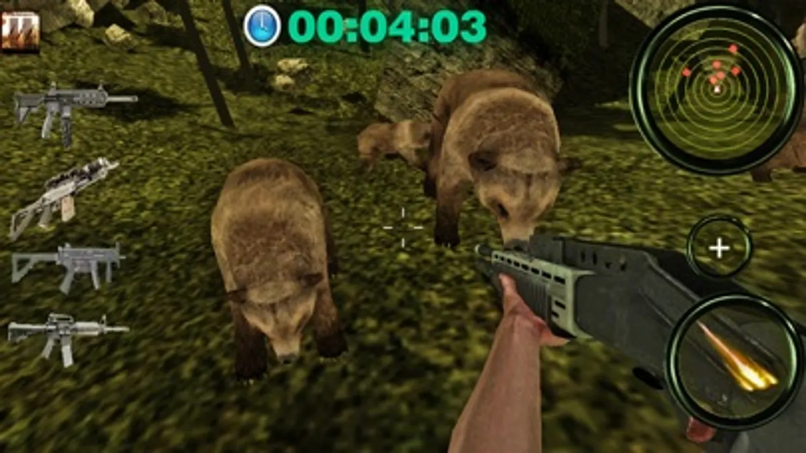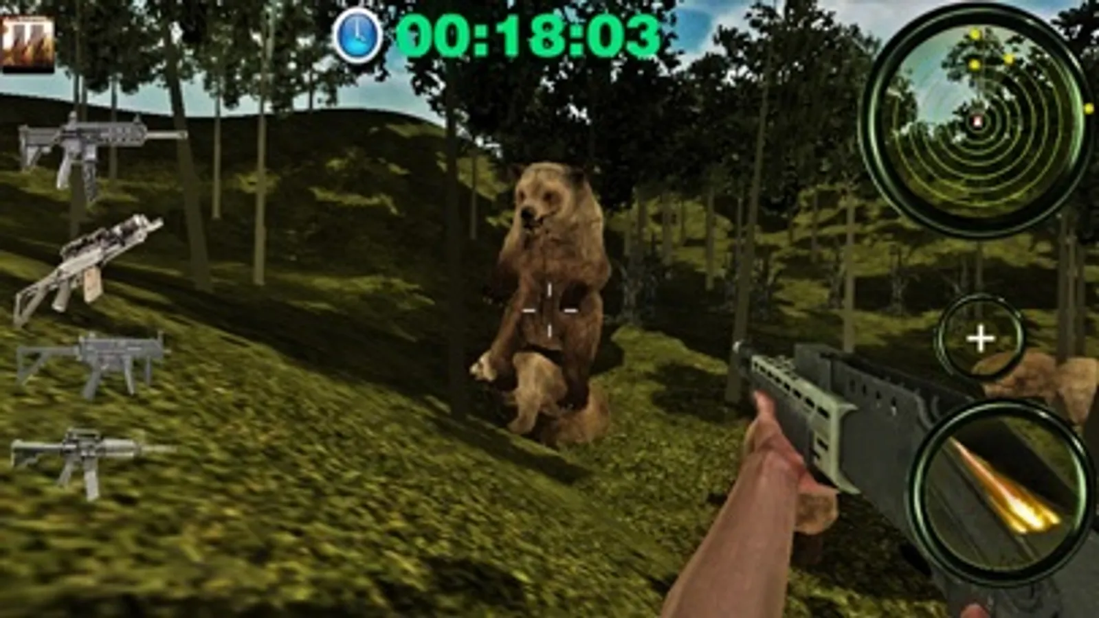 Bear Hunters are usually equipped with best rifles, snipers and other modern weapons with scope. The hunter in the jungle has to be active, alert, accurate in aiming and shooting. Bears are wild animals and can attack on the hunter, so he has to be ready to rescue himself in case of danger and escape to the safe point.