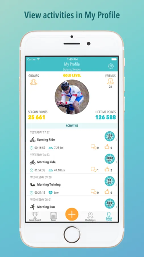 Track all sessions and points earned in 'My Profile.' Activity details include map, time, distance, and more.