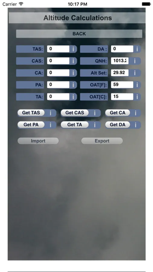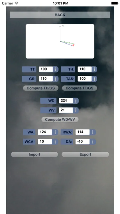 Aviation NavCalc solves all the standard problems which show up in the navigation part of flight training for getting the private pilot license and the examination. This flight computer app consists of several different modules, each designed to solve a kind of problem. To facilitate the reuse of numbers in different modules, many modules have an import and/or export feature. With this feature, numbers can be exported to a main module, and from there they can be imported again, into an other module. There’s an export or import button in modules, where it makes sense to have this feature.