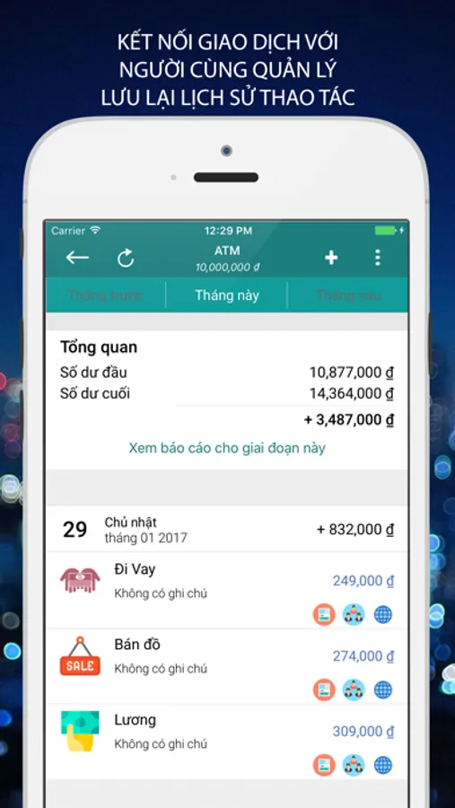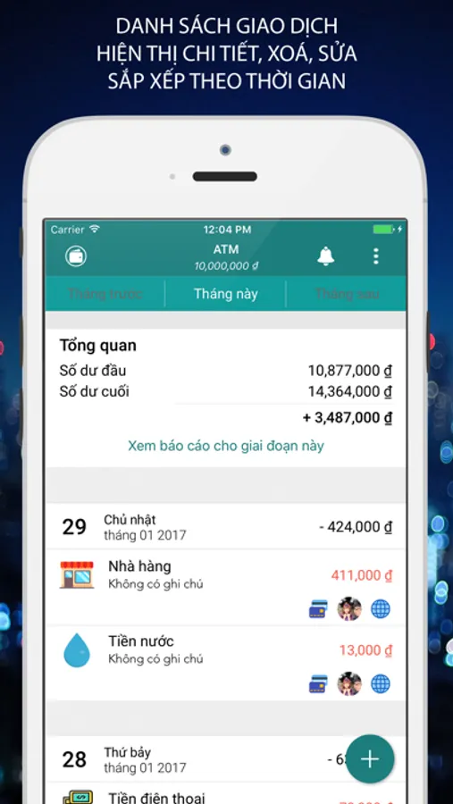 Tạo giao dịch và quản lý, thống kê theo thời gian cho các giao dịch. Đây là cách hiệu quả nhất để theo giỏi thu chi hằng ngày của bạn.