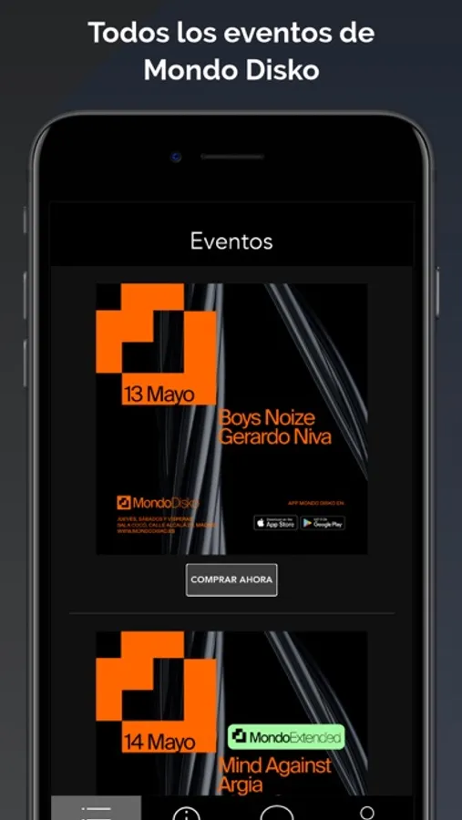 La aplicación Mondo Disko te permite ver todos los eventos de nuestra programación, comprar entradas con tan solo un toque y estar al tanto de las últimas novedades.