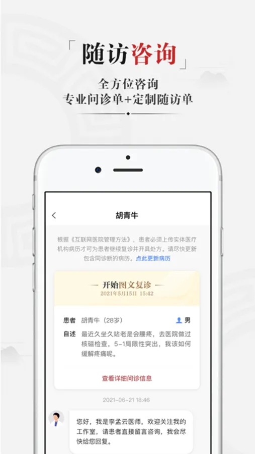 中医师可随时随地开电子/图片处方,图文语音实时进行随访咨询,便捷管理患者、自动收录病历档案。【复诊、调方、随访】在线一键完成,全方位诊疗,增加医师阳光收入。 平台为所有中医师免费提供执业保障服务,为中医师的执业之路保驾护航。
