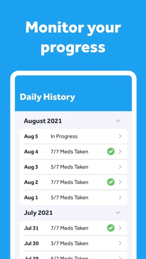• Mark medications as taken, skipped or snoozed throughout the day to stay on track