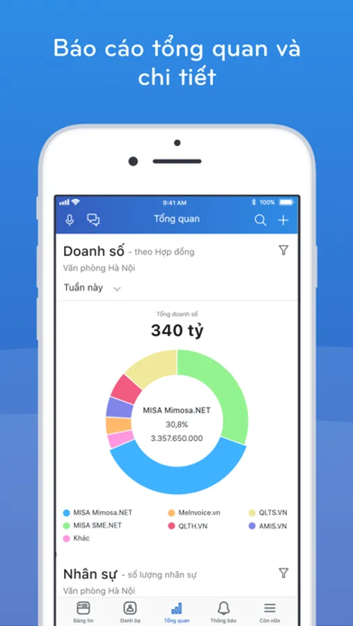 • Xem nhanh các báo cáo, thống kê liên quan tới các lĩnh vực nhân sự, kế toán, bán hàng,…
