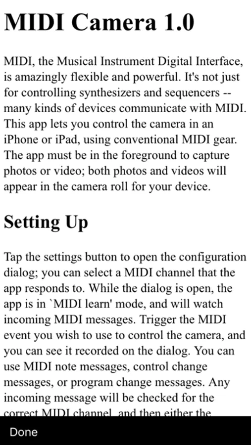 MIDI has been used to control synthesizers and sequencers for years. It's easy to use, and there are hundreds of inexpensive controllers. With MIDI Camera, Secret Base Design brings MIDI to iOS photography. Use a MIDI controller, foot pedal, or an app, to take photographs or record video.