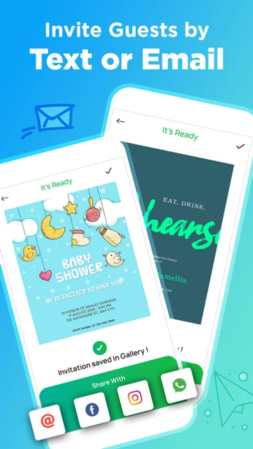 Skip the complicated design sites – whether you’re on the go, need to make invites in a snap Invitation Maker lets you create and send cards right from your iPhone or iPad directly to your recipient's email or chat.