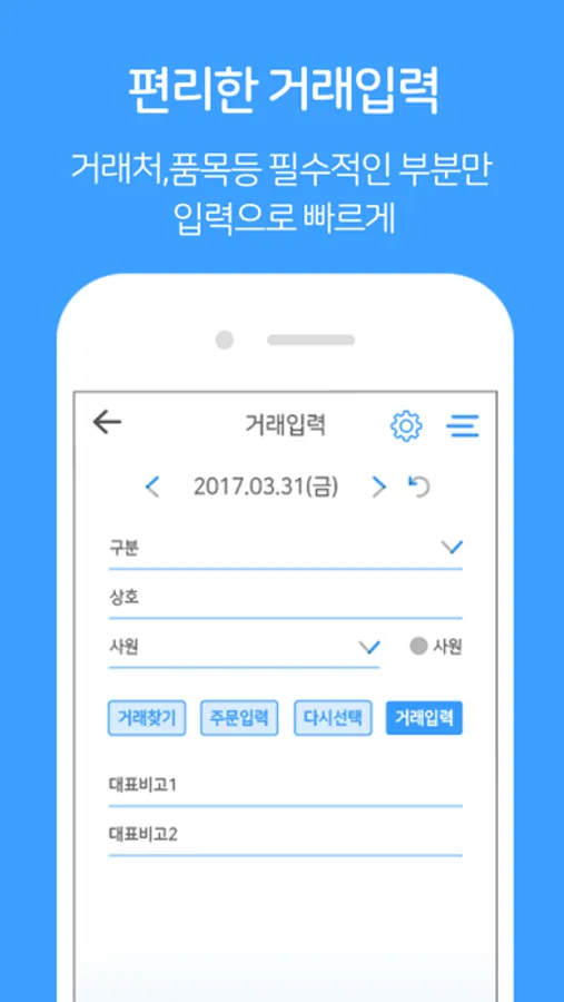 거래 입력: 매출, 매입, 견적, 발주, 수주, 제조, 지점, AS