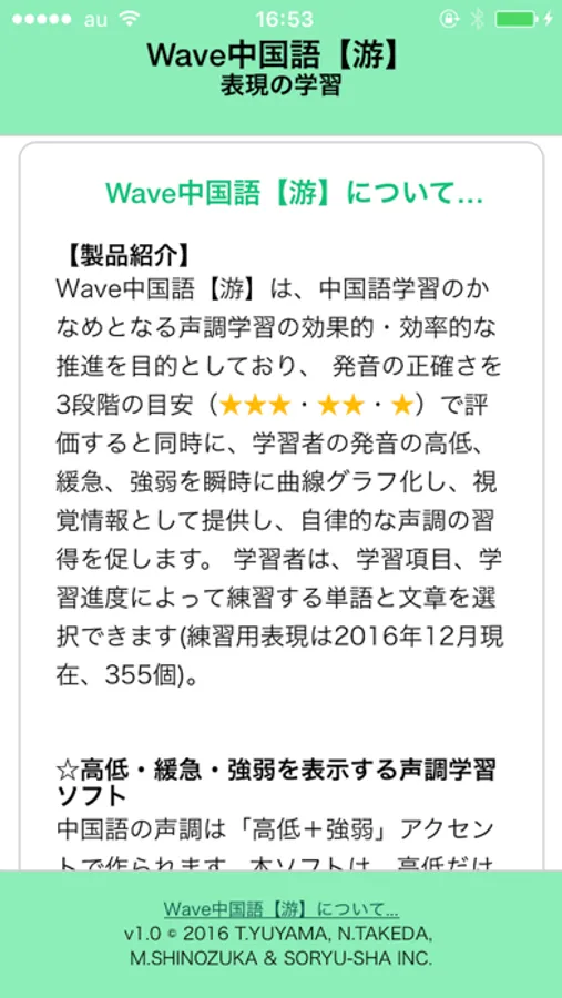 声調波形表示機能の学習効果は、本アプリケーションの母体である中国語総合学習システム“游” (http://chinese-you.net)の開発、 運用において、従来より高い学術的評価を得ています。