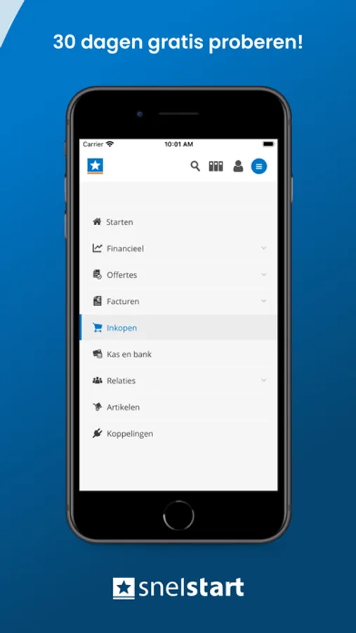 Probeer SnelStart 30 dagen gratis uit. Maak onbeperkt gebruik van de app, webapplicatie en desktopversie. Ontdek zelf hoe eenvoudig boekhouden kan zijn. Het proefabonnement stopt automatisch. Bevestigen kan op ieder moment, mét behoud van de gratis proefdagen. Bekijk onze website voor meer informatie over de verschillende pakketten.
