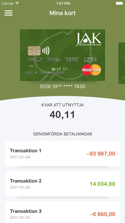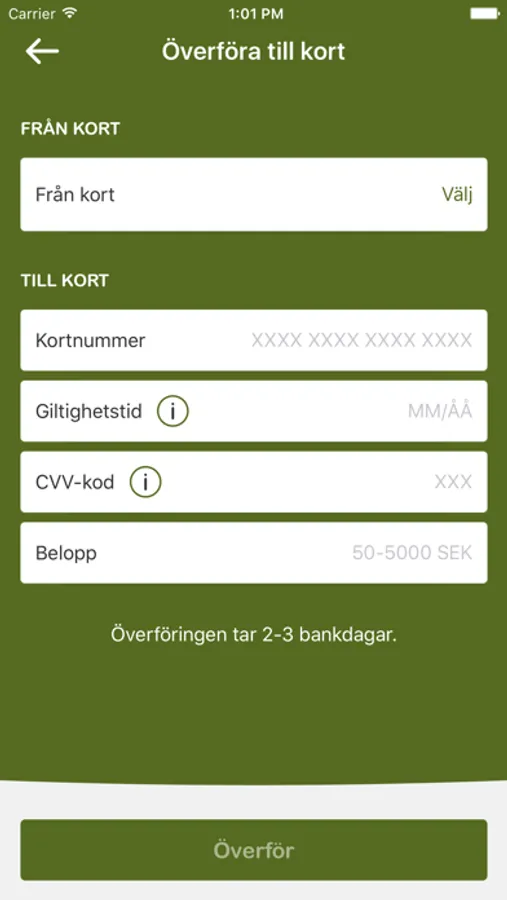 * Överföra – Möjlighet att överföra pengar till alla svenskutgivna VISA och MasterCard kort.