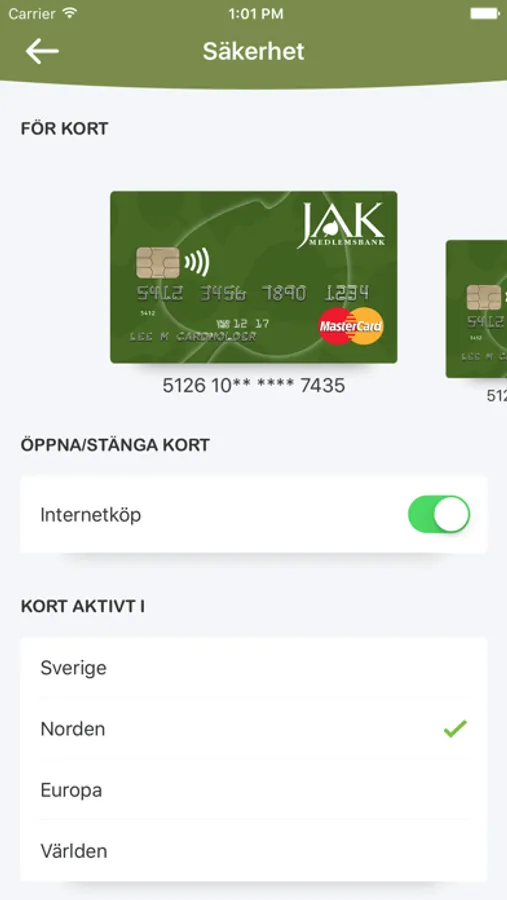 * Av/På – Möjlighet att stänga av /på kortet för köp i olika regioner utanför Sverige