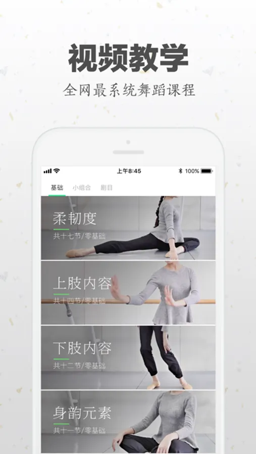 - 所有课程均针对零基础设计,并不包含应试类技巧(如空翻、剪式变身跳等)故不推荐舞蹈专业学生考试使用