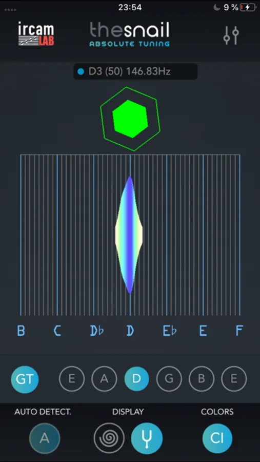 Version 2 offers an additional guitar tuning mode that is available in the tuning view. Just tap on a dedicated string name, play a note and adjust the guitar tuning accordingly. Another major improvement is the new split window mode. Whenever you do any adjustments to parameters you now see how the edits affect the visualization in the upper section. This works in both visualization modes. One mode is the snail grid, a complete musical overview of the audio spectrum. The other one, the tuner view, is especially designed to focus on the root note for tuning purposes. In both views there is a sine tuning oscillator available which is controlled simply by touching the desired note on the iPhone display. There are a lot of customizable parameters. No problem if you would like to tune transposing instruments or if you need a tuning reference other than 440 Hz.