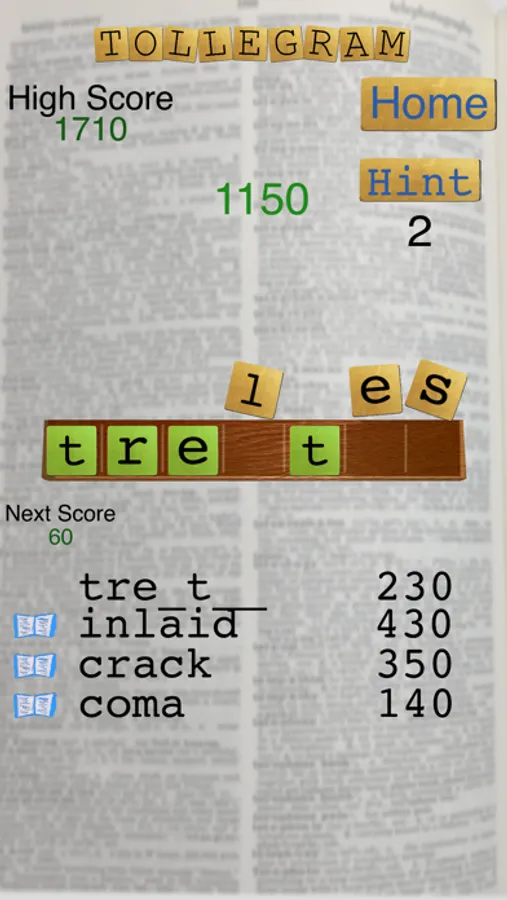 Tap the blue dictionary next to a solved word to see its definition. Each correctly placed tile increases the value earned by the next tile in the same word. Play for a high score or just to learn new words. There is no time limit so you can take as long as you need to solve each one.