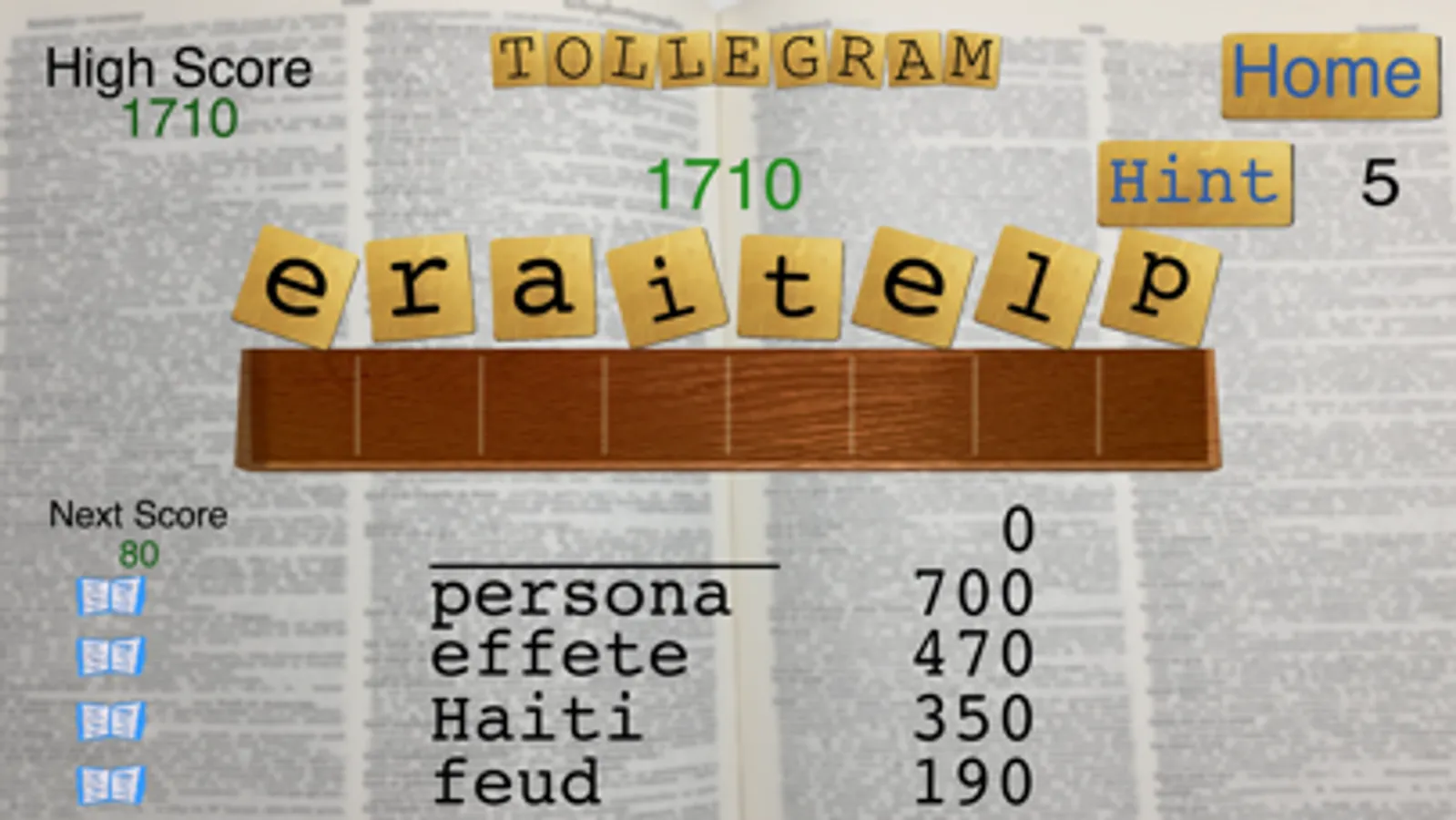 Unscramble the letters to find the word selected from the game's word list of thousands. Use hints if needed to get free letter placements. Earn more hints by solving a word with no misplaced tiles.